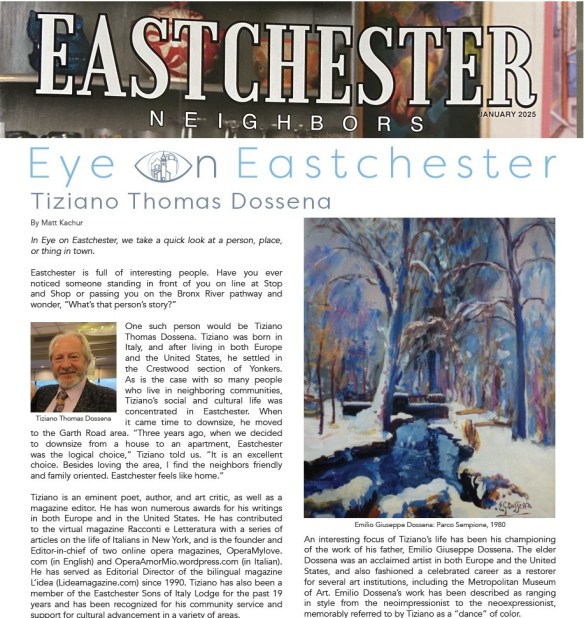 Interview Of the author by Eastchester Neighbors magazine, January 2025 Image Posted on April 3, 2025 by editoreusa Share this: Click to share on X (Opens in new window) X Click to share on Facebook (Opens in new window) Facebook Click to share on LinkedIn (Opens in new window) LinkedIn Click to share on Tumblr (Opens in new window) Tumblr Click to share on WhatsApp (Opens in new window) WhatsApp Like Loading... Related