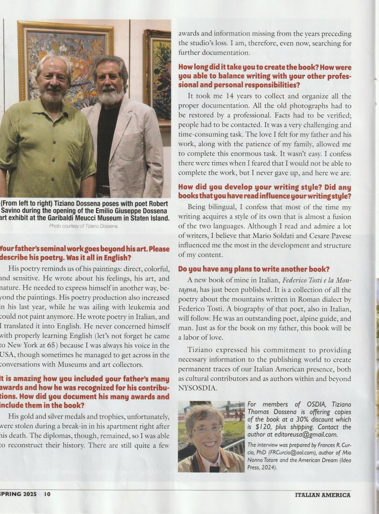 Going Beyond the Words: an Interview of Tiziano Thomas Dossena by Frances R. Curcio, PhD Posted on June 29, 2025 by editoreusa Share this: Click to share on X (Opens in new window) X Click to share on Facebook (Opens in new window) Facebook Click to share on LinkedIn (Opens in new window) LinkedIn Click to share on Tumblr (Opens in new window) Tumblr Click to share on WhatsApp (Opens in new window) WhatsApp Like Loading... Related