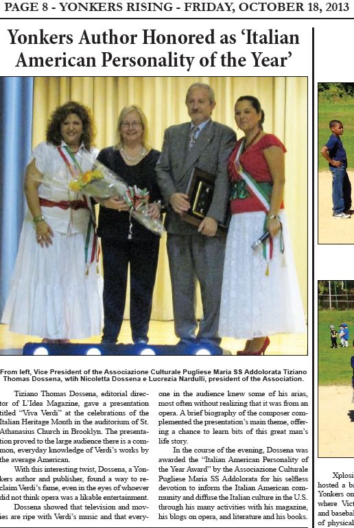 Yonkers Rising: Yonkers author honored as “Italian American Personality of the Year” Share this: Click to share on X (Opens in new window) X Click to share on Facebook (Opens in new window) Facebook Click to share on LinkedIn (Opens in new window) LinkedIn Click to share on Tumblr (Opens in new window) Tumblr Click to share on WhatsApp (Opens in new window) WhatsApp Like Loading...