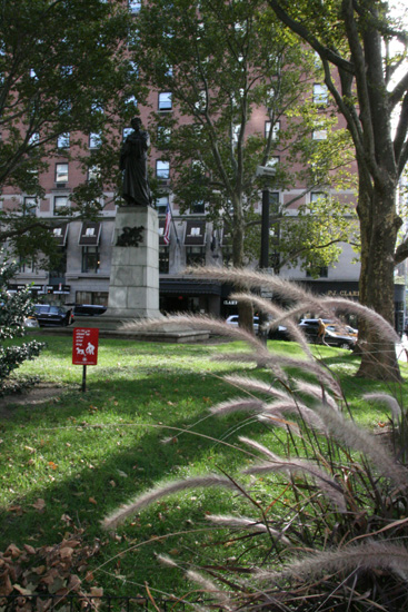 There is one statue, though, that gets overshadowed because of its location in a small park near Lincoln Center. The imposing bronze of Dante Alighieri hides amongst foliage and tree branches, right across the street from the renowned musical Center. Dante Park (or Dante Square – the place is defined in both ways) is a pleasant surprise for the few lucky ones who become aware of its presence. Nine and a half feet tall (265 cm), this bronze stands on a towering granite pedestal, making it impossible for the inattentive or hurried passerby to notice its presence.