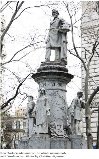 Nel lussuoso West Side di Manhattan c’è una piazza dedicata al celebre compositore italiano, Giuseppe Verdi. Una piccola area verde circonda la sua statua e quelle di quattro personaggi delle sue opere.